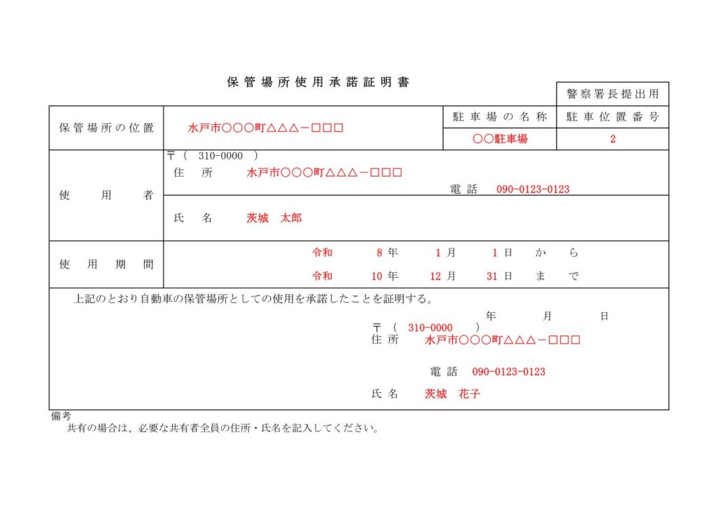 茨城県で車庫証明を申請する場合、保管場所(駐車場)の土地・建物(立体駐車場、ガレージ等)が申請者の所有でない場合は、使用権原疎明書面(使用承諾証明書)を添付します。
